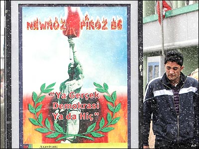 تابلوی بزرگی که به مناسبت نوروز در شهر کرد نشين وان در شرق ترکيه برپا شده و بر روی آن به زبان ترکی نوشته شده "يا دمکراسی يا هيچ".