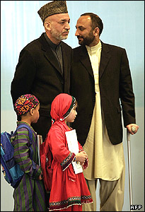 حامد کرزی، رییس جمهور افغانستان و حنیف اتمر، وزیر آموزش و پرورش این کشور در کنار دو کودک افغان در مراسمی در کابل.