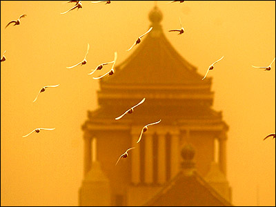 پرواز کبوترها در توفان شن در شهر چانگچون، چین.