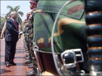 ایازالدین احمد، رئیس جمهور بنگلادش در حال بازدید از مراسم رژه ارتش این کشور که به مناسبت سی و ششمین سالگرد استقلال بنگلادش در داکا پایتخت این کشور برگزار شد.