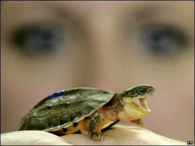 یک بچه لاک پشت تازه متولد شده از گونه ای در حال انقراض در باغ وحش چستر در شمال انگلستان.