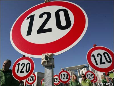 تظاهرات مخالفان طرح تحديد سرعت در بزرگراه های آلمان در مقابل دفتر صدر اعظم آلمان در برلين. آلمان از جمله معدود کشورهای جهان است که در اکثر بزرگراه هايش محدوديت سرعت وجود ندارد.