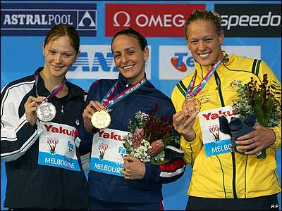 لیلا وزیری (وسط)، شناگر ایرانی تبار آمریکا، موفق شد در مسابقات قهرمانی جهانی شنا در ملبورن استرالیا، رکورد 50 متر کرال از پشت را که از آن خودش بود، بهبود بخشد.