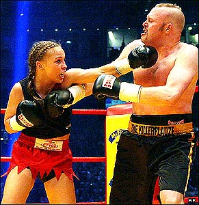 استفان راب (راست) مجری تلویزیون آلمان طی یک مسابقه از قهرمان زن مشت زنی این کشور، رجینا هالمیش در کلن آلمان شکست خورد. راب، شش سال پیش نیز در مسابقه ای مشابه از حریفش هالمیش شکست خورده بود.