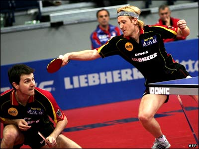 مسابقات اروپایی تنیس روی میز در بلگراد جریان دارد. دو بازیکن آلمانی حمله تیم مقابل را دفع می کنند.