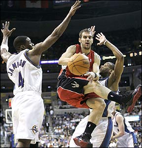 دو تیم تورنتو رپتر و واشنگتن ویزارد در چارچوب مسابقات ان بی ای در واشنگتن با هم به رقابت پرداختند. خوزه کالدرون بازیکن اسپانیایی تیم تورنتو رپتور (در وسط) از سوی دو بسکتبالیست تیم حریف احاطه شده است.