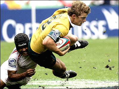 در دومین روز تورنمنت راگبی هنگ کنگ، آمریکا و استرالیا به مصاف هم رفتند. نیک کامینس استرالیایی توسط جون ناکیکا آمریکایی از حرکت بازداشته شده است.