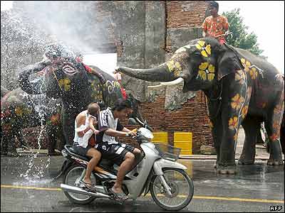 در جشنواره سونگکاران در یکی از ایالت های مرکزی تایلند، فیل ها بر روی موتورسواران آب می پاشند.