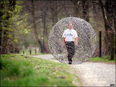 آرند دروسل، هنرمند آلمانی در یک کره ساخته شده از سیم های فولادی راه می رود. او با پیمودن مسیری 300 کیلومتری، قصد دارد به قول خودش توجه همگان را به "بی تعادلی" بسیاری از مردم و نیازشان به "روان درمانی اجتماعی" جلب کند.