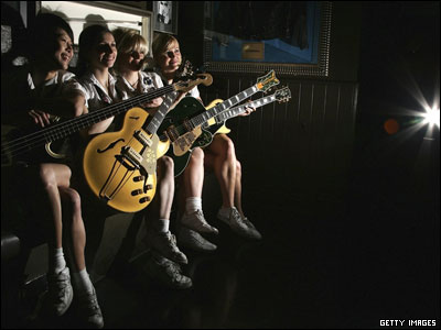 در لندن، چند نفر از کارکنان "هارد راک کافه" در یک مراسم خیریه با گیتارهایی که به حراج گذاشته شده اند عکس می گیرند.