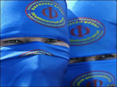 در قرقیزستان، مخالفان دولت در یک تظاهرات ماسک هایی با نشان "جببه متحد" به سر کرده اند.