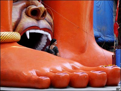 يک عابد هندو در حال ترک معبدی که به تازگی به شکل خدای ميمون در اساطیر هندو در دهلی نو ساخته شده است. ساخت اين معبد 33 متری بيش از 12 سال زمان برده است.