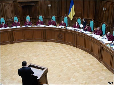 نمايی عمومی از دادگاه عالی اوکراين در کی یف. دو هفته پيش ویکتور یوشچنکو، رئيس جمهور اوکراین در پی اختلاف با حزب رقيب تصميم به انحلال پارلمان اين کشور گرفت که با واکنش ویکتور یانوکوویچ، نخست وزير اوکراین مواجه شد. |