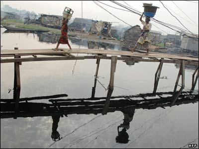 گذر مردم بر روی پلی در محله ای فقير نشین در لاگوس پايتخت نیجریه. احزاب مخالف نيجريه تهدید کرده اند که انتخابات ریاست جمهوری اين کشور را که 21 آوريل برگزار می شود، تحریم خواهند کرد.