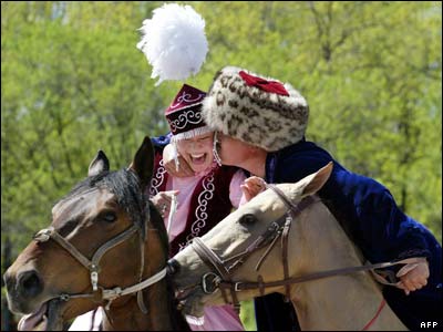 یک سوار قرقیز دختری را در طول مسابقه اسب سواری در بیشکک می بوسد.