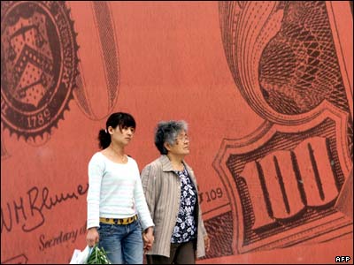 زنان چینی در پکن از کنار تابلوی تبلیغاتی که دلارهای آمریکایی را نشان می دهد قدم می زنند.