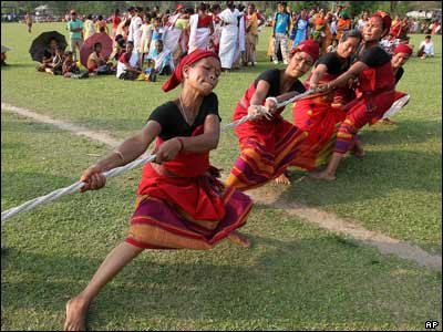 زنان قبیله با لباس های سنتی در مسابقه طناب کشی در جشنواره بوکو که در هفتاد کیلومتری شهر گوهاتی در هند برگزار شده است. |