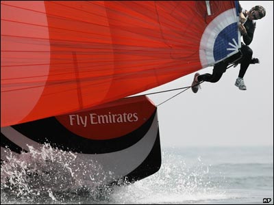 جیرو لوماس از تیم قایق سواری کشور نیوزیلند، در حال تنظیم بادبانهای قایق خود در حین مسابقه قایق سواری که در والنسیا اسپانیا در جریان است