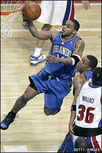 در ادامه مسابقات بسکتبال حرفه ای آمریکا (NBA)، بازیکنان دو تیم اورلاندو مجیک و دیترویت پیستونز، به سمت سبد حمله می کنند. دیترویت 98 بر 90 مجیک را شکست داد.