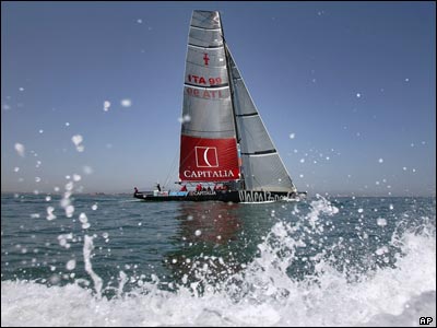 تیم قایق سواری کشور ایتالیا، در حال تنظیم بادبانهای قایق خود در حین مسابقه قایق سواری که در والنسیا (اسپانیا) در جریان است.