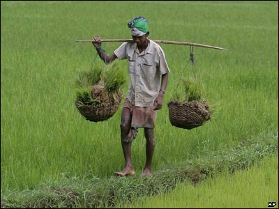 کشاورزی در حال حمل محصولش در مزرعه ای در خارج از شهر گواهاتی در شرق هند. صنعت کشاورزی منبع درآمد 115 میليون خانوار هندی و يا 70 درصد جمعيت اين کشور است.