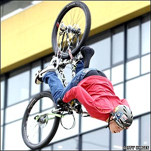 یک دوچرخه سوار در حاشیه برنامه های شرکت خودروسازی نیسان برای معرفی اتومبیل تازه اش نیسان قشقایی در نیوکاسل بریتانیا، به انجام حرکات نمایش مشغول است. |