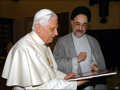 محمد خاتمی رئیس جمهور سابق ایران طی یک دیدار خصوصی در واتیکان با پاپ بنديکت شانزدهم، رهبر کاتوليک های جهان دیدار کرد. در عکس فوق او در حال نشان دادن هدیه اش به پاپ است.