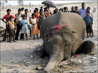 اهالی دهکده ای در هند بر روی جسد فیلی که ظاهرا بر اثر رعد و برق جان باخته گل ریخته اند.