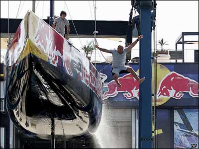 یکی از اعضای تیم قایقرانی سوئد، پس از رسیدن به مقام نایب قهرمانی مسابقات جهانی کاپ "لوئی ویتون" در والنسیای اسپانیا، با پریدن به داخل آب خوشحالی می کند.