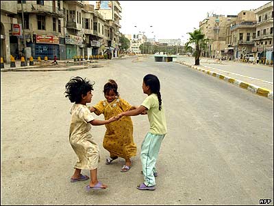 کودکان عراقی مشغول بازی در خیابانی در بغداد که به علت اعمال منع رفت و آمد در هنگام برگزاری نماز جمعه هیچگونه خودرویی در آن تردد نمی کند.