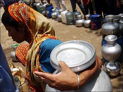زنی مسلمان در صف دریافت آب از یک معبد در شهر داکا بنگلادش. مسئولین این معبد به دلیل کمبود آب در این شهربه مسلمانان اجازه ورود و استفاده از آب این معبد را داده اند.