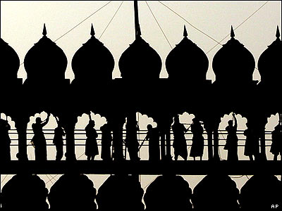 هنرمندان هندی در حال اجرای رقص نمایشی در قلعه سرخ در دهلی نو. این مراسم در بزرگداشت صد و پنجاهممین سالگرد قیام مردم هند علیه نیروهای بریتانیایی مستقر در این کشور برگزار شد.