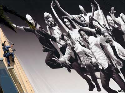 شخصی در حال نصب پوستر جشنواره فیلم کن که از 16 تا 27 ماه مه در شهر کن در جنوب فرانسه برگزار خواهد شد