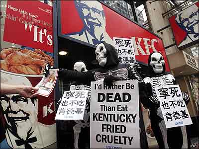 اعتراض فعالان حمايت از حیوانات در مقابل يکی از رستورانهای زنجیره ای کنتاکی در هنگ کنگ نسبت به روش پرورش و کشتن مرغهايی که اين رستوران استفاده می کند.
