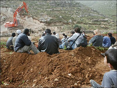 فعالان صلح اسرائيلی، فلسطينی و خارجی نظاره گر کار بولدوزر اسرائیلی هستند که شهرک عفرات را در اراضی فلسطينی گسترش می دهد. |