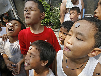 کودکان فيلیپینی در جریان"روز جشن سن ريتا" که در حومه مانيل برپاست، در مسابقه ای سعی می کنند، سکه های روی پيشانی شان را بدون استفاده از دست به دهانشان نزديک کنند.