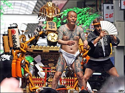 مردی با بدن خالکوبی شده بر روی معبد متحرکی که به "ميکوشی" معروف است. در جریان فستيوال سه روزه "معبد آساوکا" که در توکيو برپاست، بيش از يک ميلیون نفر شرکت کرده اند.