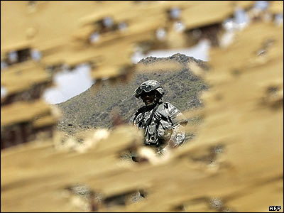 پلیس نظامی ارتش آمریکا در پشت يک سیبل چوبی در حال آموزش دادن افسران پلیس افغانستان در ولایت خوست است.