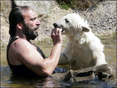 توله خرس قطبی و مسئول نگهداری حيوانات در باغ وحش برلين به آبتنی مشغول اند. دمای هوا در برلين به بيش از 25 درجه سانتيگراد رسیده است.
