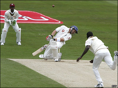 مت پريور (وسط) از انگلستان در دومين روز مسابقه کریکت بين انگلستان و هند غربی که در لیدز جریان دارد.