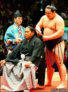 کیوکوشوزونا کشتیگ گیر سومو اهل مغولستان (نشسته) طی مراسمی اعلام بازنشستگی کرد. |
