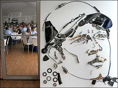 تصویر الکس ووز، راننده جوان تیم ویلیامز، که با قطعات یدکی اتومبیل بصورت نقش برجسته ساخته شده.