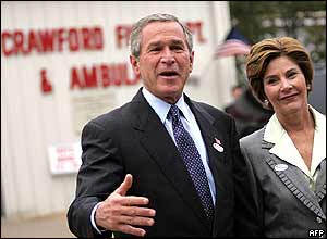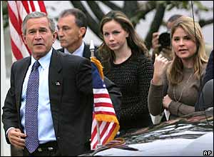 پرزيدنت بوش، به همراه دو دخترش، باربارا (چپ) و جنا، برای دادن رای وارد شهر کرافورد، تگزاس، می شوند
