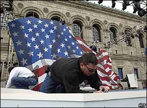 کارگران در بوستون درحال احداث سکويی هستند که آقای کری از آنجا پيروزی يا شکست را خواهد پذيرفت