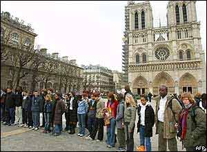 توريستها در پاريس در برابر کليسای جامعه نوتردام آيين سکوت داشتند