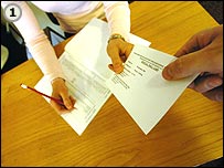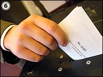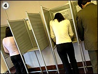 برگه رای خود را به يکی از جايگاه های سرپوشيده که صندوق رای در آن قرار گرفته است می بريد