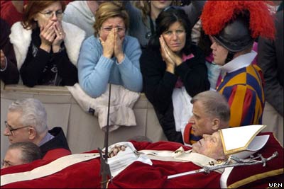 مراسم خاکسپاری پاپ ژان پل دوم، رهبر کاتوليکهای جهان ميليونها نفر را در رم گرد آورد. بيش از دويست نفر از رهبران جهان نيز برای شرکت در مراسم تدفين و ادای احترام به پاپ به ميدان سن پيتر واتيکان آمدند.