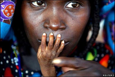 دستهای کودک يک ساله نيجری بر روی لبهای مادرش در حاليکه در درمانگاه تغذيه اضطراری در شهر تاهوا در نيجر هستند. نيجر در سال 2005 شاهد بدترين خشکسالی تاريخ خود بود که ميليونها قحطی زده بر جا گذاشت.