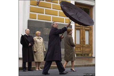 ولاديمير پوتين، رئيس جمهور روسيه و همسرش ليوميلا در حال تماشای جورج بوش، رئيس جمهور آمريکا و همسرش که به مناسبت شصتمين سالگرد پايان جنگ جهانی دوم برای احترام به قربانيان جنگ در مسکو حضور داشتند.