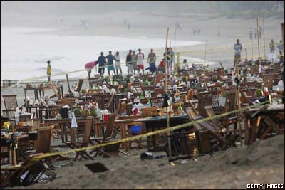 در جزيره بالی در اندونزی، بمبگذاران انتحاری سه رستوران و کلوب شبانه را منفجر کردند که منجر به کشته شدن نزديک به بيست نفر وم جروح شدن 100 نفر ديگر شد. اين دومين بمبگذاری مرگبار در سه سال گذشته بود که صنعت گردشگری بالی را هدف قرار می داد.
